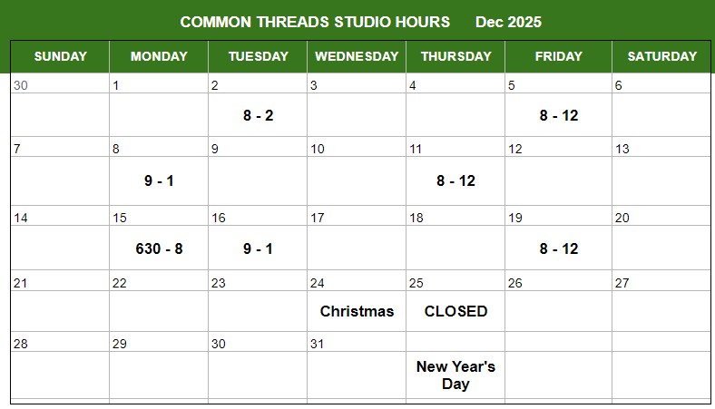 Below are dates and times when you can come to our studio and work on projects with us, or pick up a tote of items to work on from home.